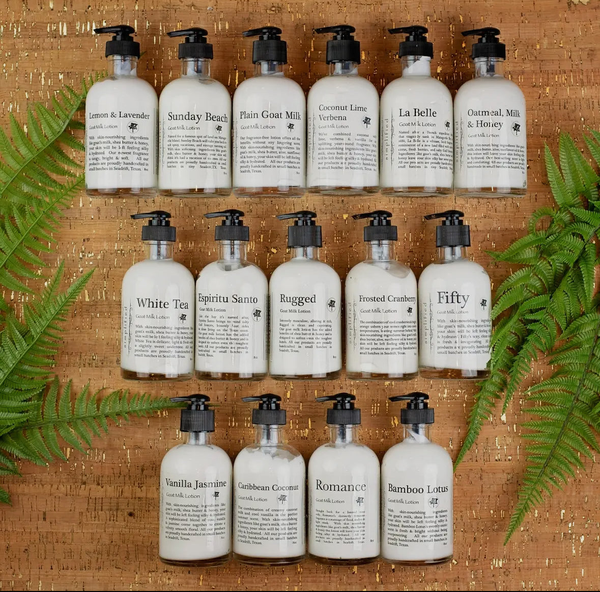 This seriously luxurious lotion contains goat's milk, honey and natural shea butter. Goat's milk is high in proteins, triglycerides, vitamins A, B6, B12 and E. All this and more go into making this lotion an excellent moisturizer. Honey is a natural antioxidant and anti-inflammatory agent. Natural shea butter aids in healing and skin regeneration. Your skin will thank you! This lotion now comes in an 8oz glass apothecary bottle with clear labeling staying true to our vision of a simpler product.