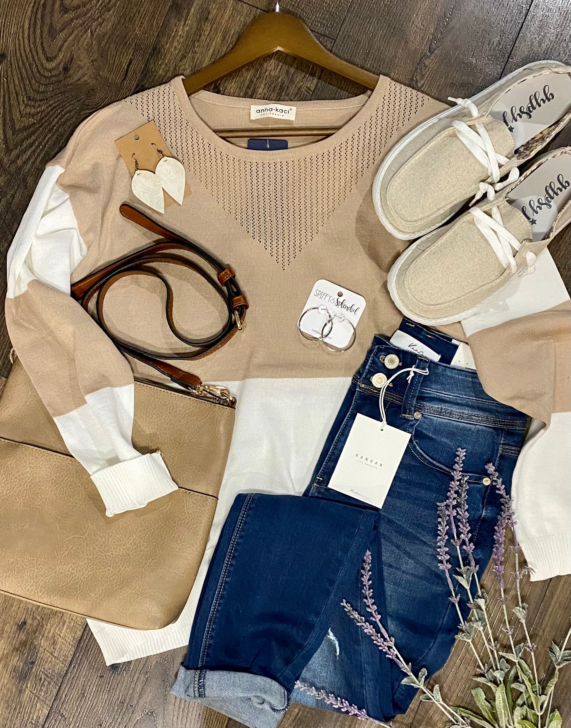 The Anna-Kaci sweater is detailed with a beautiful asymmetrical net detail by the neck line of the garment. Features a round neck line, color blocking, long sleeves, and a relaxed fit. The fit is loose and you can size down on this.