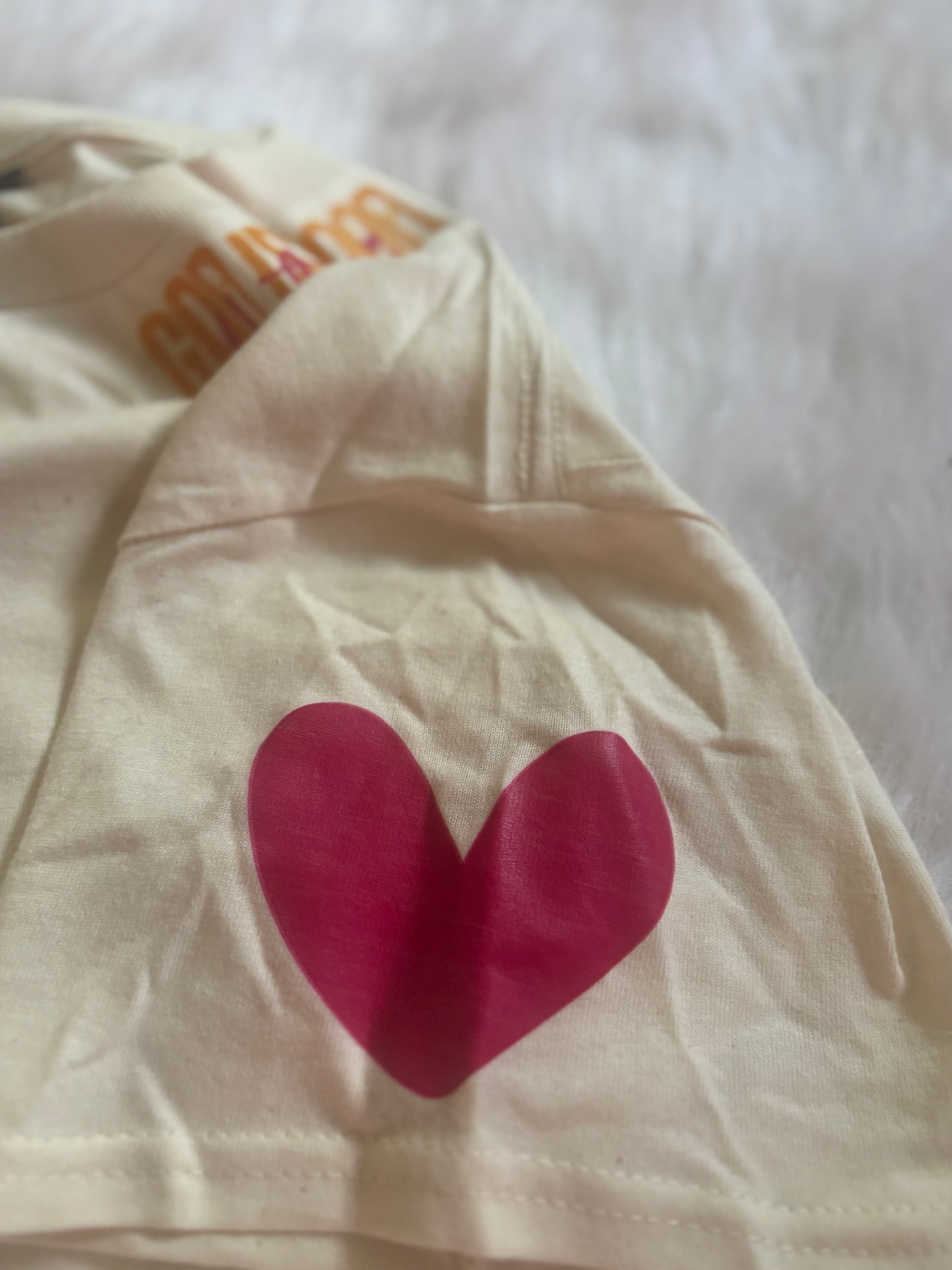 Professionally printed on a natural Gildan soft style tee. Print is close to the collar and heart is on the sleeve.
